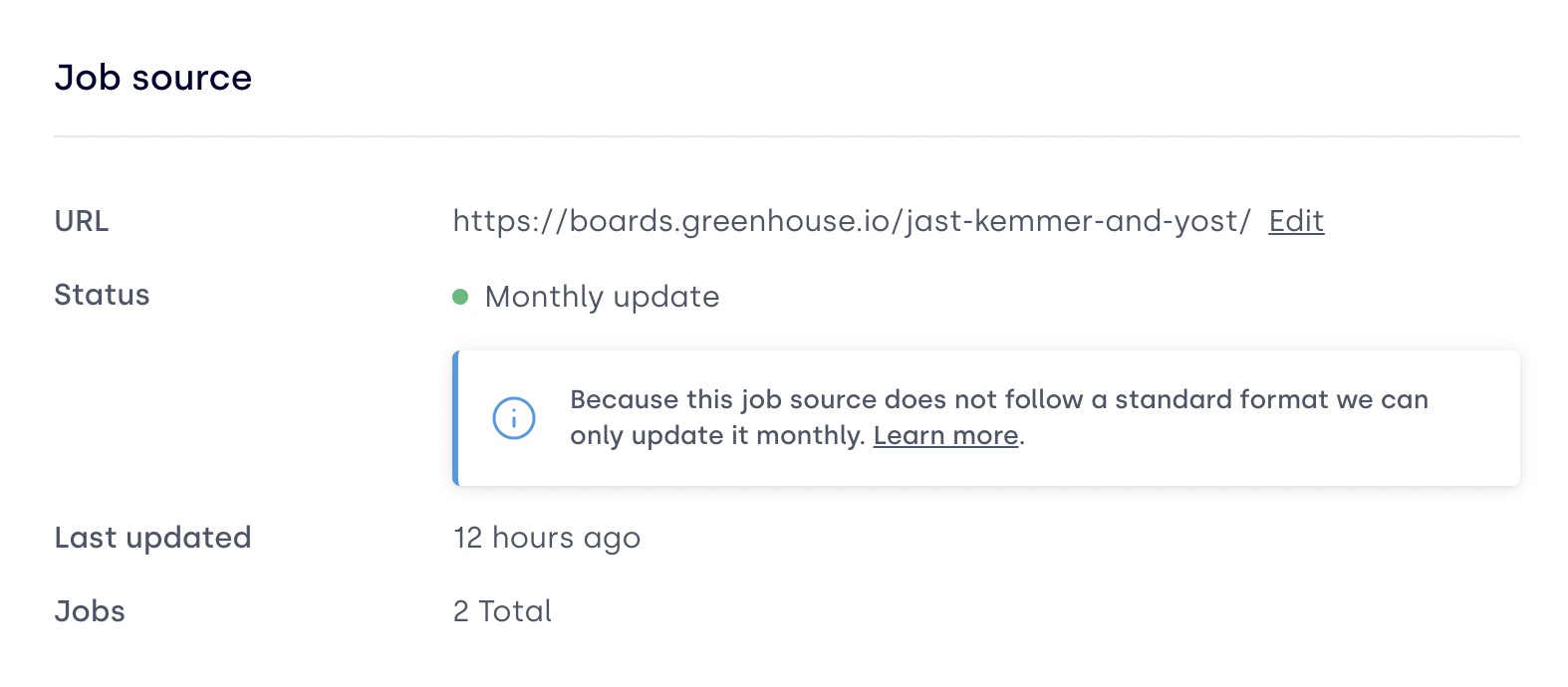 Note: for companies with job sources in this status, to ensure your job board is updated more frequently, we suggest you contact the company to share our guidance for optimal job sources. If they have no job source in our optimal job source category, you can post jobs on their company profile.